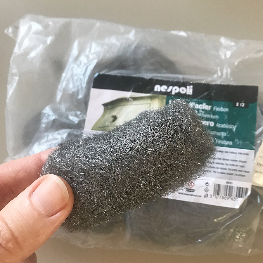 - Następnie szlifujemy delikatnie całą powierzchnię drobną wełną stalową i ściereczką zbieramy pył pozostały po szlifowaniu. Już samo przetarcie wełną spowoduje spore odświeżenie i blask, ale skoro coś ścieramy, to należy dołożyć nową warstwę.
